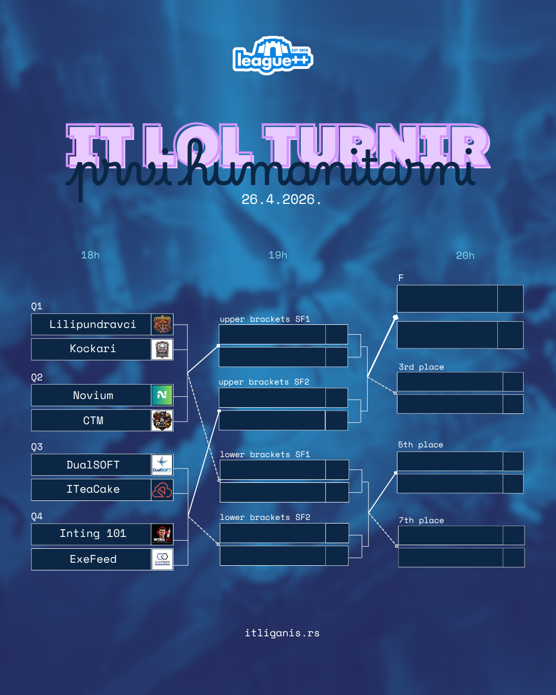 Iako se mečevi igraju online, pobrinuli smo se da nijedan trenutak ne prođe neopaženo. Rezultate i atmosferu momente možete pratiti putem naših zvaničnih kanala: Instagram profila i Viber Community kanal Lige++. Najbolji momenti biće objavljeni na našem YouTube kanalu.